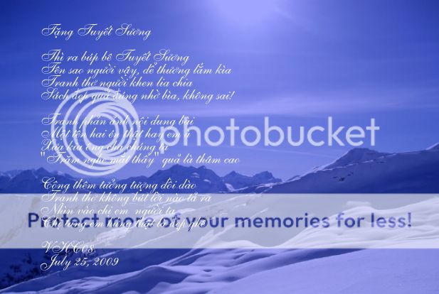 Cô bé Búp Bê xinh xắn Hiền hoà chân thật dễ thương Tranh thơ sắc màu đẹp thắm Tuyệt vời tên gọi Tuyết Sương ! Từ tranh em tỏa sáng ngần Tô thắm thêm vần thơ chị Từ tranh em đẹp thiên thần Thơ đượm ngời hơn chất...ý...! Cảm ơn Tuyết Sương nhiều nhé ! Bằng câu thơ...dệt chân thành Đơn sơ tình chị em mình Ngọt ngào tranh - thơ tuyệt thế !!! AiTinh 11:52 PM, Saturday, July 25, 2009
